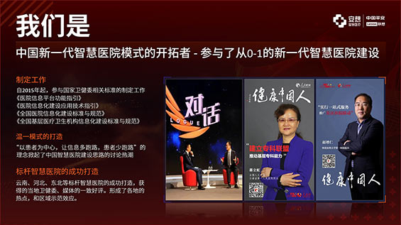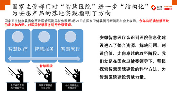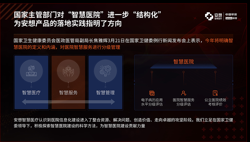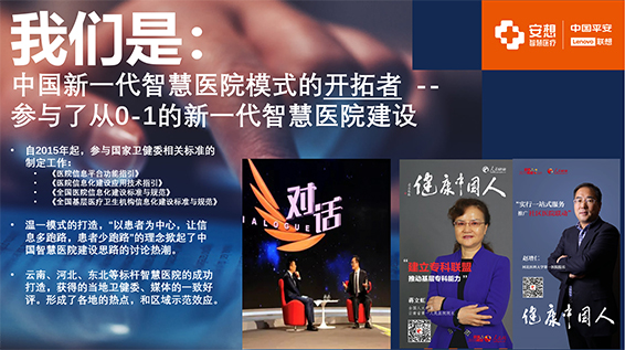 安想(平安联想)智慧**前身为联想智慧**,这是新一代**信息技术代表力量。作为**信息化整体解决方案供应商,安想(平安联想)智慧**依托平安集团和联想集团的战略,致力于用云计算开发体系重构医院管理和业务系统。绎奇完成发布会的PPT设计。