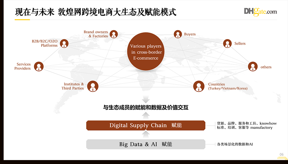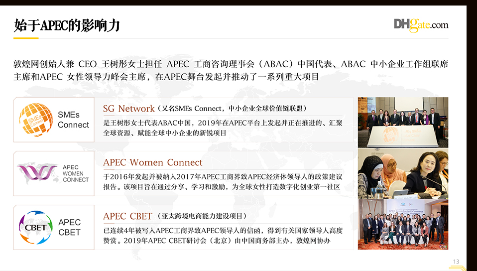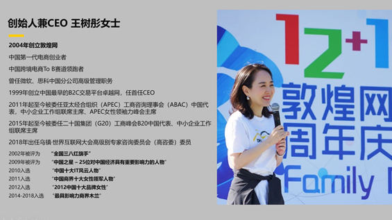 敦煌网是中国领先的B2B跨境电商在线交易服务平台。为跨境电商产业链上中小微企业提供“店铺运营、流量营销、仓储物流、支付金融、客服风控、关检汇税、业务培训”等全链路赋能,帮助中国制造对接全球采购,实现“买全球,卖全球”。自2004年成立以来,敦煌网已经取得这些成绩。绎奇完成贵单位企业介绍PPT制作。