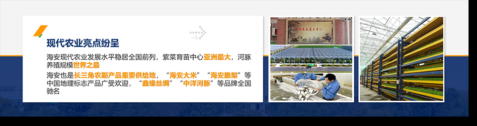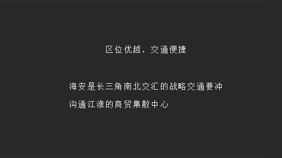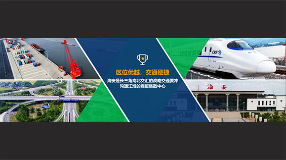 海安,江苏省县级市,由南通市代管,地处江苏省中南部,位于南通、盐城、泰州三大市交界处;东临黄海,与如东接壤,西与泰州的姜堰区为邻,南和如皋、泰兴相连,北与东台毗邻;海安东西直线长71.1千米,南北宽39.35千米,总面积1180平方千米。绎奇完成招商会PPT制作。
