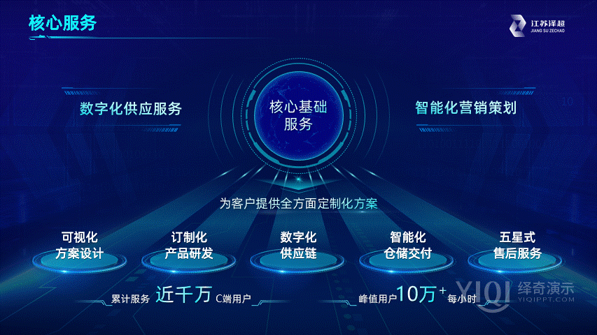 在与江苏泽超的合作中,绎奇充分了解客户的产品、服务和品牌文化,通过丰富的设计经验和专业技能,为客户开发出了一套创意独特、令人印象深刻的PPT作品。在设计过程中,采用了多种设计技巧和创新元素,结合“Adobe After Effects”的动画渲染,对每一个细节进行把控,力求做到更震撼的视觉传达效果。绎奇将继续保持一贯的高水平和专业性,为客户提供更好的PPT设计服务。