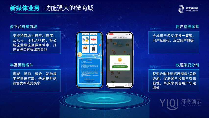 江苏泽超主营从事文化用品的策划、制作、销售,是专业的综合性礼品供应商,涉及庆典纪念、积分兑换礼品、商务赠品、广告促销品、工艺品、办公礼品、家具家纺、福利品、一类医疗器械、通讯器材、照明器材、摄影器材、互联网信息技术开发、技术咨询等。绎奇演示完成展会宣传PPT设计与制作。