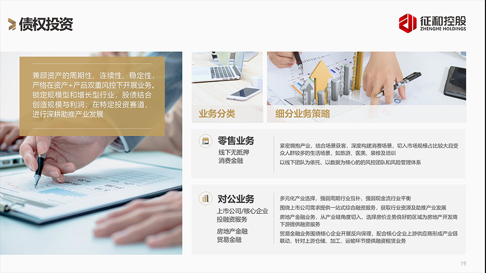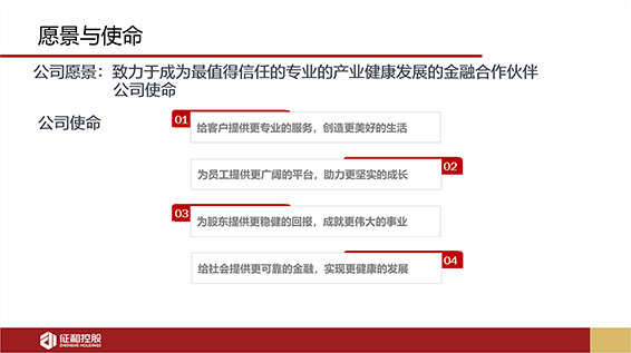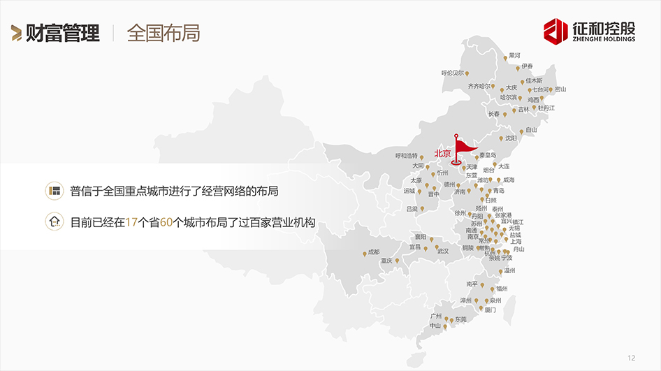 征和控股于2009年成立,十年来凭借雄厚的资本实力,在60余座城市和地区建立起了协同服务网络。为客户提供高质量、深层次的金融服务,帮助客户实现资产稳健增值,构建产业+个人的多远金融服务生态体系。绎奇完成公司介绍PPT设计制作。