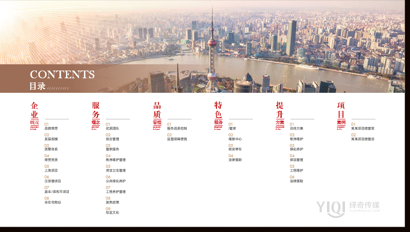 首批国家一级资质物业管理企业;起步于1987年,扎根于上海的本土物业企业;上海市物业服务综合百强前二十;上海市物业服务综合能力五星级企业;完成首批物业服务履约质量评价“符合”报告;2020年上海市公众满意度测评第81名;56个项目先后获得国家、省市级优秀项目荣誉;绎奇完成贵单位对外介绍的PPT设计。